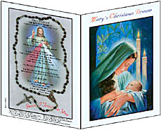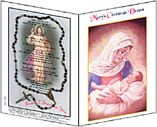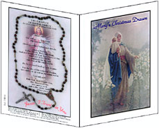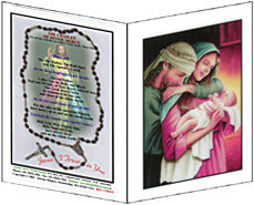 A loving image showing the gentle chaste affection within the Holy Family. The Chaplet of Mercy on the back, superimposed by the 2003 Divine Mercy image and surrounded by Rosary beads.