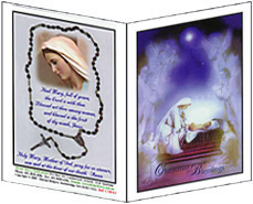 A very special image showing Our Lady praying towards Her Divine Son while surrounded by angels. Image of Our Lady on the back, surrounded by Rosary beads and containing the Hail Mary prayer.