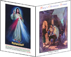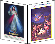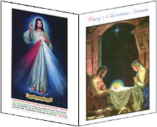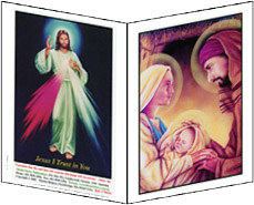A pleasant picture of Our Lady and Saint Joseph holding the new born Jesus. An image of the 2004 Divine Mercy is given on the back.